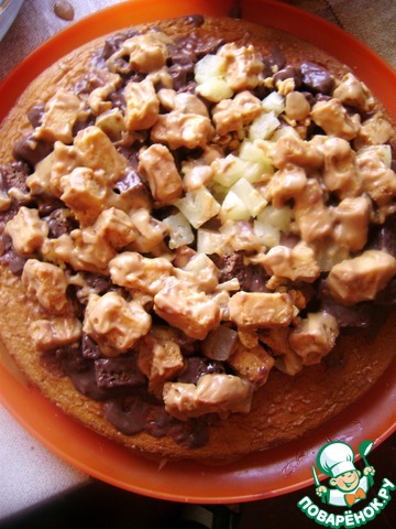 Чуть теплой карамельной глазурью полить торт поверх охлажденной шоколадной.