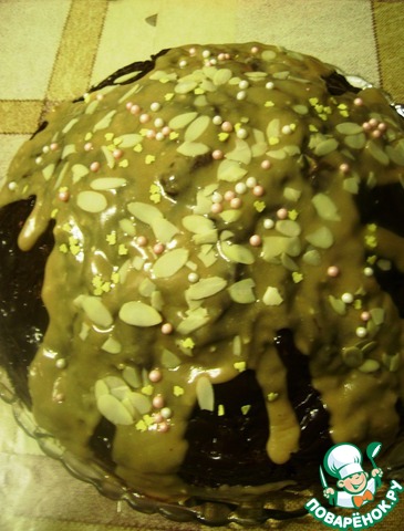 Растопить в микроволновке горький шоколад с тремя ложками сливок, тщательно размешать и полить получившейся глазурью торт сверху, стараясь распределить на всю горку тонким слоем.