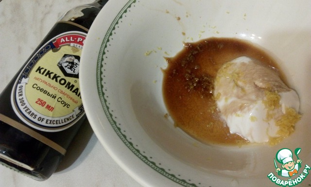 Для заправки смешиваем йогурт, цедру половины лимона и соевый соус ТМ Kikkoman.