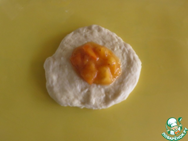 От теста отделить кусочек размером со среднее куриное яйцо, сделать из него лепешку, выложить чайную ложку начинки.