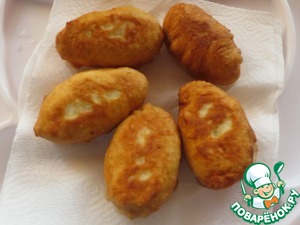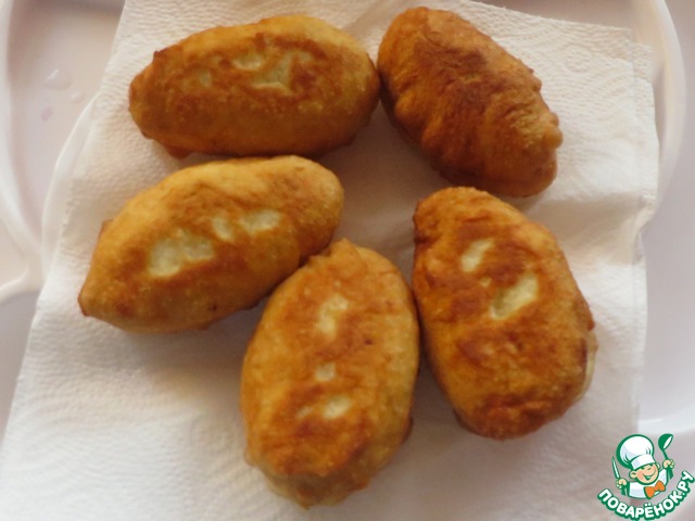 Слепить пирожки, обжарить их на растительном масле, выложить на бумажное полотенце, чтобы впитался лишний жир. Готовые пирожки посыпать пудрой.