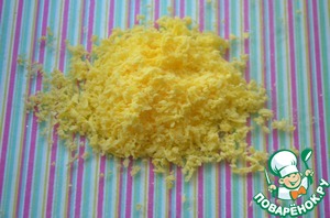 Соединить в миске крабовые полочки, желток и тертый сыр.
