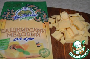 Нарезаем сыр Белебеевский Медовый кусочками.