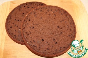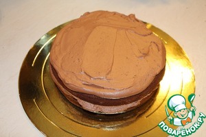 Пропитать каждый корж пропиткой (два внутренних коржа пропитать с двух сторон). Собрать торт, промазывая каждый корж кремом (одну треть крема оставить на обмазку торта).