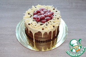 Для шоколадного декора растопить шоколад (на водяной бане или в микроволновой печи). Лично я растапливаю шоколад на электрической плите в маленькой кастрюльке на самой маленькой мощности. Нанести шоколад на хорошо охлажденный корж. Задекорировать готовый торт на ваше усмотрение. Я использовала шоколадную стружку, малину, зерна кофе. Для шоколадной стружки растопленный шоколад вылить на гладкую поверхность (у меня силиконовый кондитерский коврик) и дать ему полностью застыть. Затем ножом снять стружку.