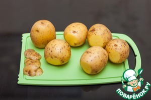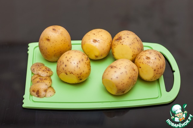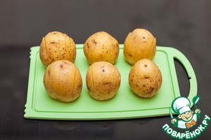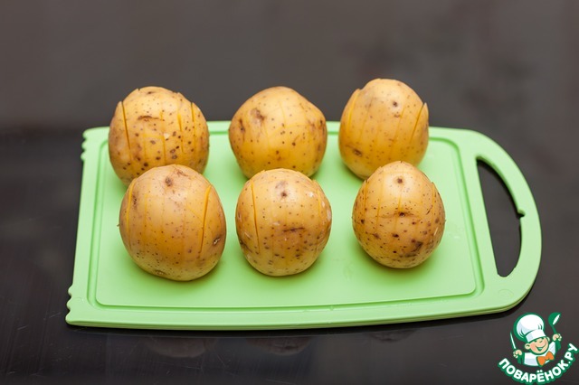 Картофель среднего размера помыть, отрезать "попки" для устойчивости.