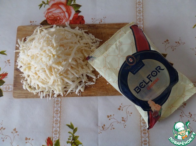 На крупной терке натираем сыр. Я использую сыр "BELFOR" Белебеевского молочного комбината.