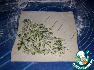 На рабочей поверхности раскатываем слоеное тесто в виде квадрата. Выкладываем начинку. С одной стороны делаем небольшие надрезы.