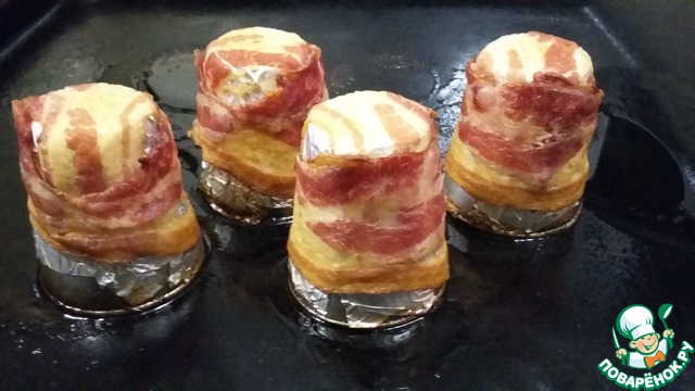 На железные стаканчики-рюмочки выкладываем вот таким образом бекон и ставим в духовку при температуре 180 градусов на 10-15 минут. -