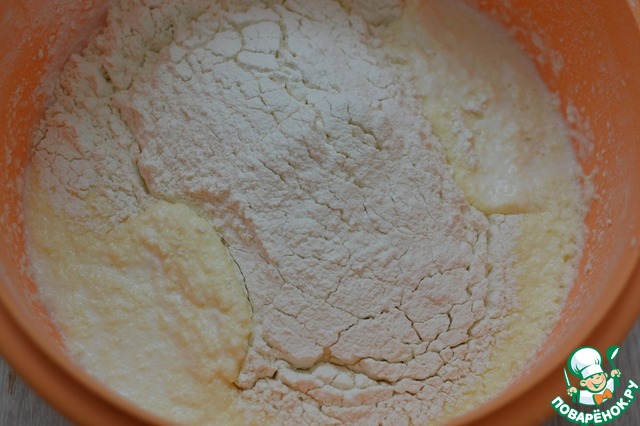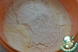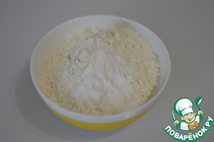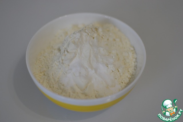 В отдельной миске соединяем муку, разрыхлитель, соду, перемешиваем.