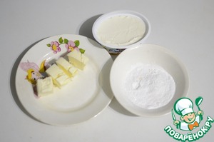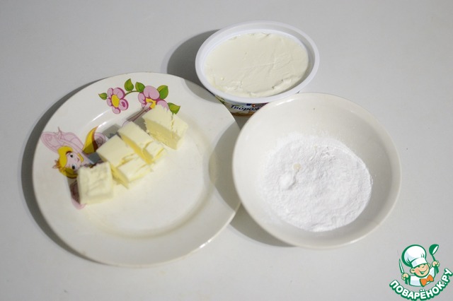 Готовим крем. Берем размягченное сливочное масло, сахарную пудру и холодный творожный сыр (я использую хохланд или альметте).