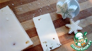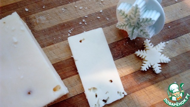 Сыр нарезать на ломтики и с помощью кондитерского плунжера вырезать снежинки. -