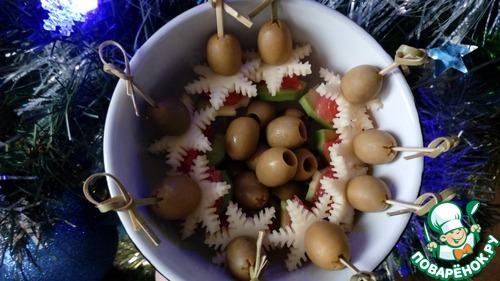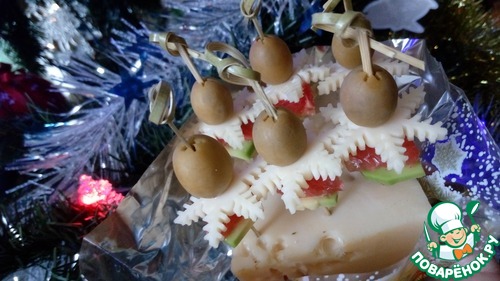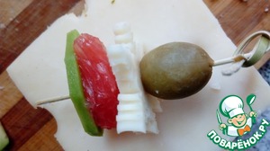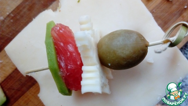 Собрать ингредиенты на шпажку: оливка - снежинка из сыра - грейпфрут - авокадо. А все вместе получается очень неожиданно, сочно и свежо.