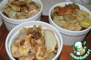 Но тут можно сделать заготовку заранее (а к приходу гостей все поставить в духовку) и при запекании в духовке картофель и мясо не выделяют лишнюю жидкость.