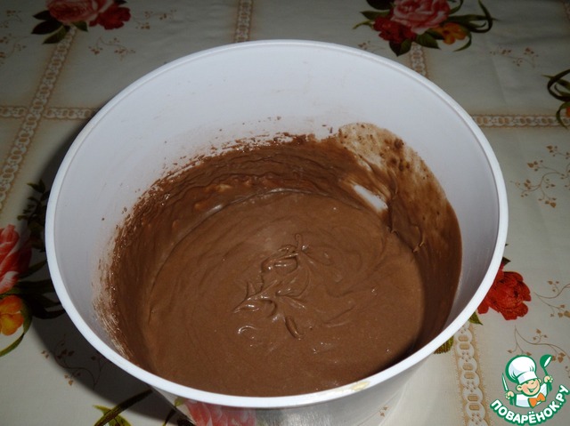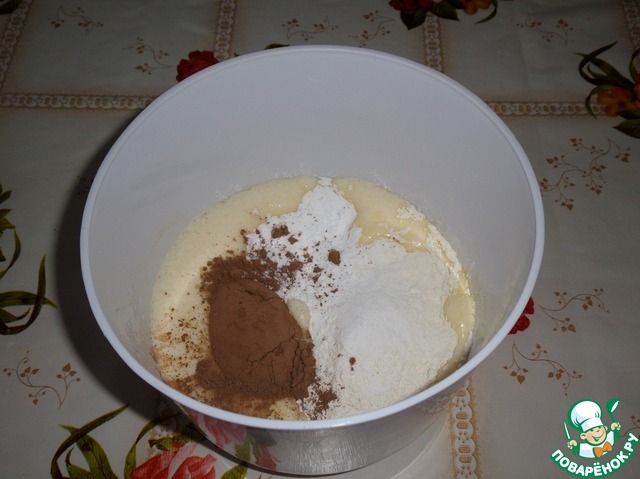 Добавляем просеянную муку, крахмал, разрыхлитель теста и какао-порошок.