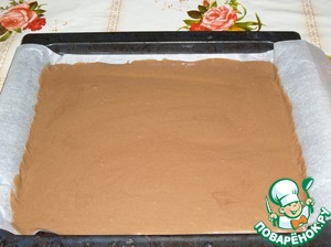 Выкладываем тесто на противень, застеленный пергаментом. Равномерно распределяем. Ставим противень в разогретую духовку.