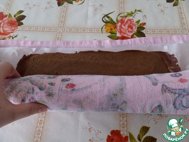Пергамент с испеченной основой кладем на полотенце и сворачиваем рулет. Оставляем на 30 минут.