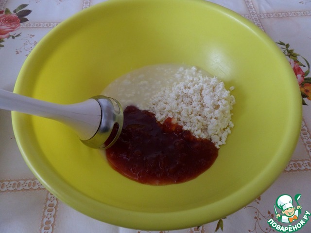 Готовим творожный крем. В чашку выкладываем творог, сгущенное молоко и домашнее абрикосовое варенье.