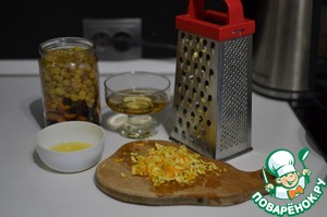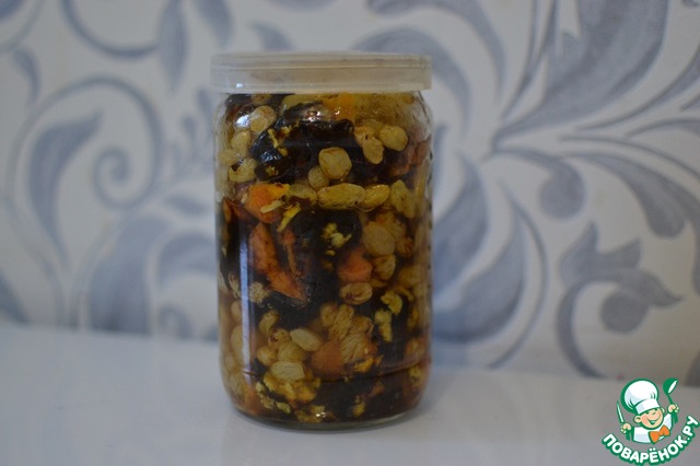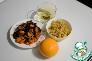 В миске (банке) перемешать сухофрукты, сок и цедру апельсина, добавить коньяк (ром, настойка), еще раз все перемешать. Оставить мариноваться на ночь, главное чтобы фрукты впитали влагу, но в идеале нужно неделю.