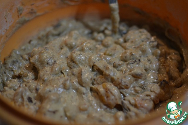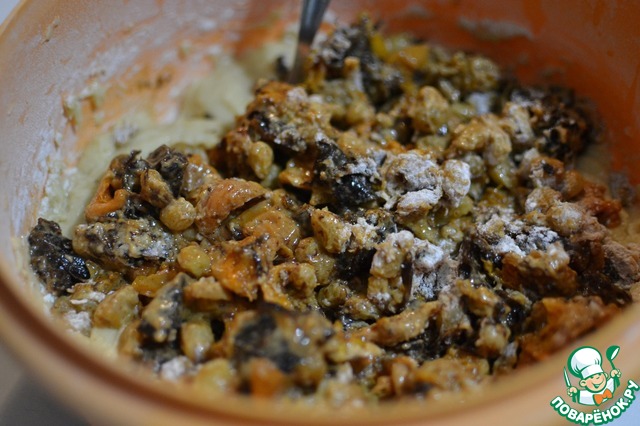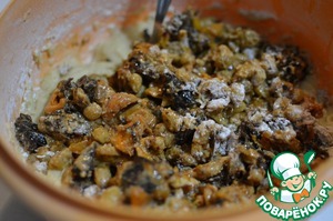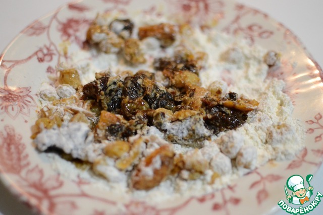 Обвалять сухофрукты в 1-2 ст. л. муки, чтобы они хорошо покрылись мучной оболочкой, это нужно для хорошего распределения ягод в тесте.