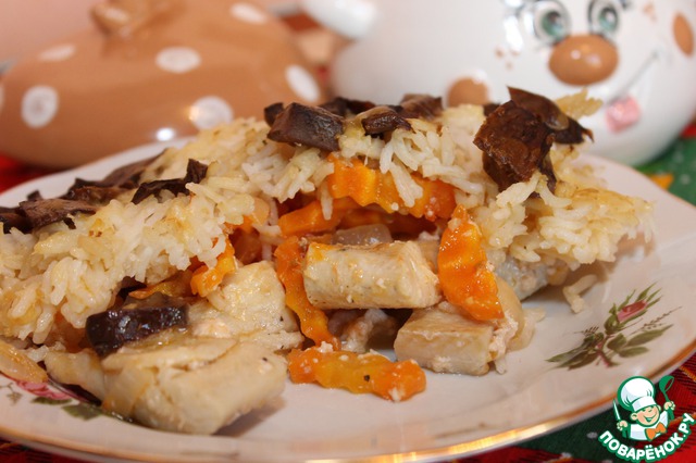 Равномерно распределить рис, добавить кусочек сливочного масла. Уложить маринованные грибочки, налить немного молока.