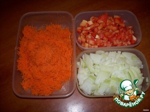 Лук мелко порезать, морковь потереть на тёрке,помидоры - кубиками.