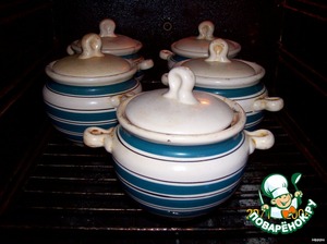 Поставить горшочки в холодную духовку, запекать 35 минут при 150 градусах. За 5 минут до готовности снять крышечки, включить духовку на 200 градусов, подрумянить.