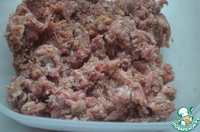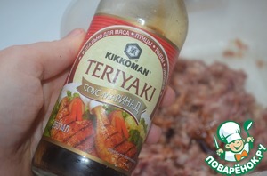 Добавить измельченный репчатый лук, тертый имбирь, чеснок, яйцо и соус-маринад.