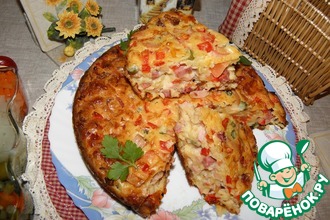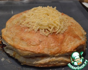 Готовый пирог посыпаем сверху натертым сыром и ставим на одну минуту в духовку, чтоб он расплавился. -