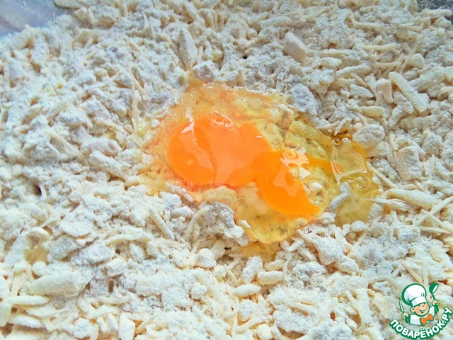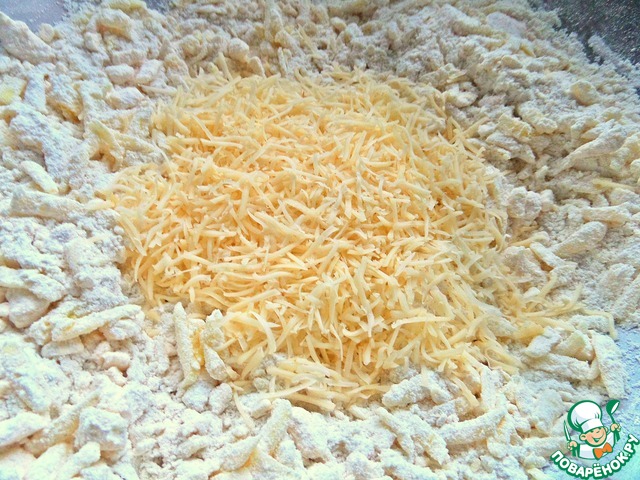 • Всыпать половину тёртого сыра в тесто-крошку.
