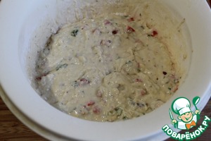 В тесто добавить колбасу, вяленые томаты, зелень по вкусу, каперсы или маринованные огурчики, болгарский перец и перемешать.
