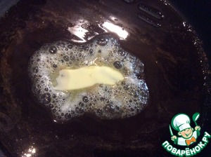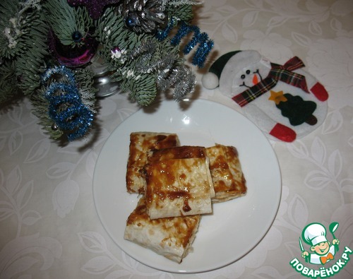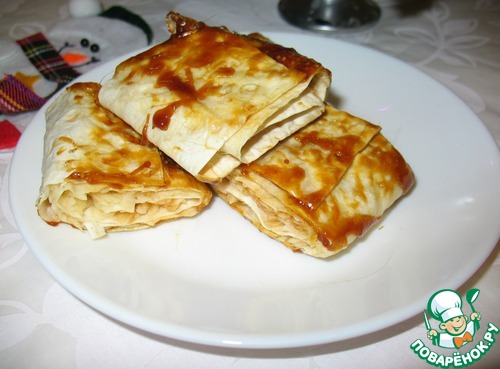 Когда большая часть сахара растопится, добавить сливочное масло. Аккуратно перемешать. Выложить лаваш с яблочной начинкой и обжарить по 2 минуты с каждой стороны. Кушать лучше сразу после приготовления.