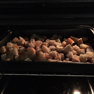 Готовим сухари. Для этого нарезаем хлеб кубиками и ставим в разогретую до 180-200*С духовку минут на 5-7.
