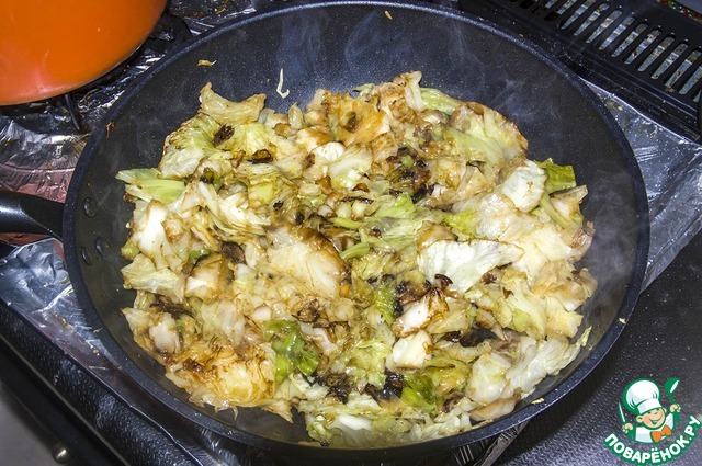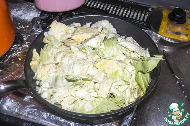 Капусту (режем произвольно - не очень мелко и жарим не растительном масле. Бывает, добавляют других овощей - лук, морковку, перец. Баловство, на мой взгляд.