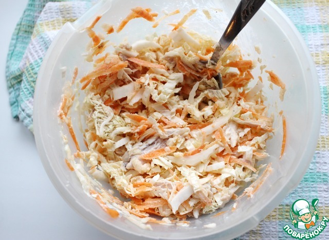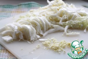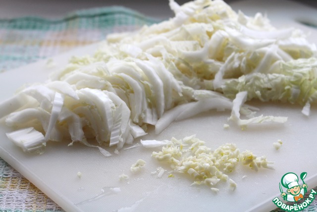 Капусту пекинскую нашинковать, а чеснок почистить и мелко измельчить.
