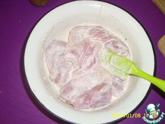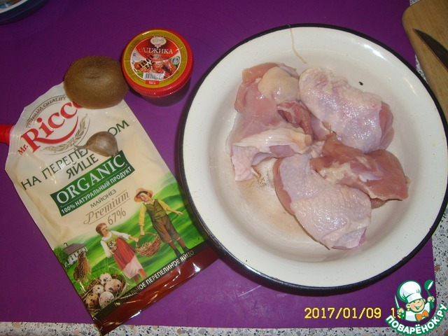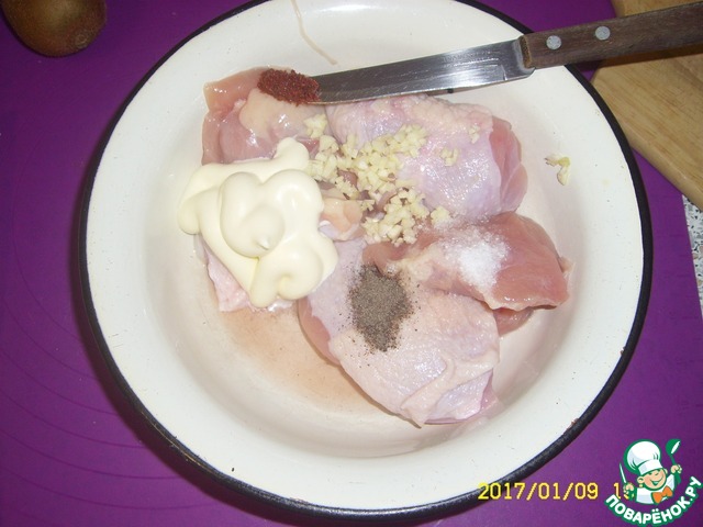 Натереть солью, перцем черным молотым, порубить мелко зубчик или два чеснока (у меня был один большой), добавить аджику на кончике ножа и майонез пару ложек. Так же кому нравиться более румяный вид можно добавить 1ч. л. сахара.