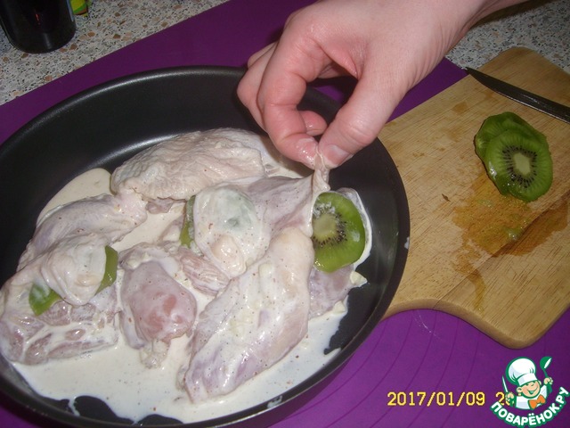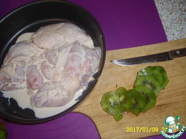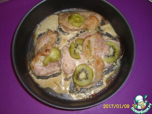 Курочку выкладываем в форму для запекания, пластики киви кладем под кожицу каждого филе или просто поверх (кому как нравится). Так же по желанию сверху можно посыпать тертым сыром, но нам с сыном и так показалось хорошо и вкусно без сыра.