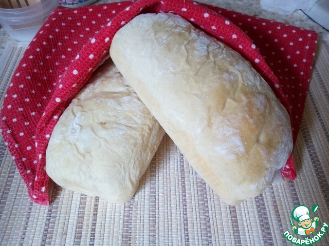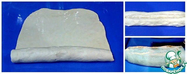 По истечении времени тесто обмять, разделить на две части и каждую раскатать прямоугольником (~20*30). Обмазать оливковым маслом, свернуть в плотный рулет и положить швом вниз на силиконовый коврик (или пергамент). Сверху вдоль сделать один разрез и убрать в теплое место на 30 минут.
