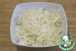 Капусту тонко нашинковать, чуть присолить, помять хорошо руками.