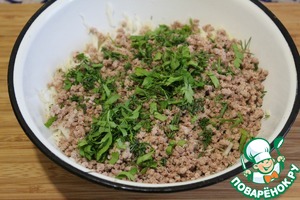 Мясо провернуть через мясорубку и добавить в капусту, посолить, поперчить, добавить чеснок и нарезанную зелень, белки.