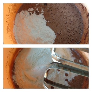 Яйца взбить пару минут вместе с сахаром и какао. Добавить сметану, пол банки сгущеного молока и растительное масло. Взбить еще секунд 15.