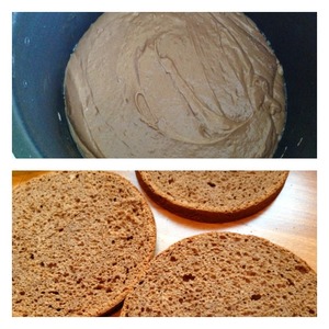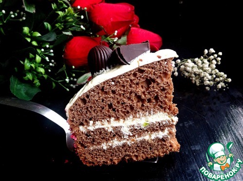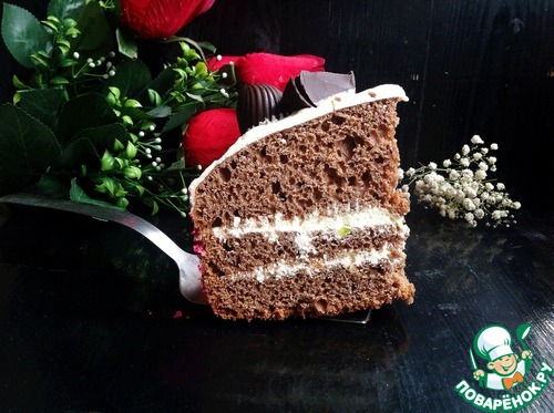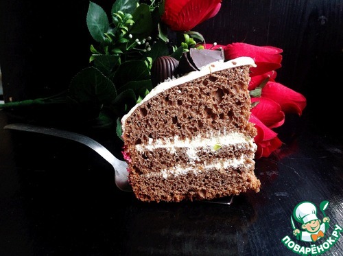 Тесто выложить в чашу МВ, предварительно смазав ее растительным маслом. Поставить режим выпечка на 60 мин. Готовый бисквит полностью остудить и разрезать на 3 коржа. Пропитать каждый корж коньячной пропиткой: соединить коньяк с ледяной водой.