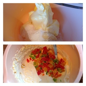 Делаем крем: взбить на больших оборотах миксера до загущения ( минут 5-7) 1 банку сгущеного молока и 250 гр мягкого сливочного масла. Цукаты мелко нарезать. От крема отложить 4-5 ст л с горкой крема ( он пойдет на верхушку торта). В оставшийся крем добавить цукаты и перемешать тщательно крем. Убрать крем в холодильник минут на 20-30.