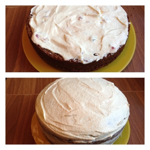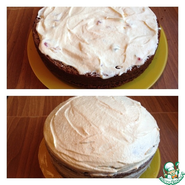 Первый и второй корж обильно смазать кремом с цукатами. Верх торта кремом, без цукатов, который мы с вами отложили.