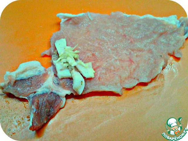 Сало нарезаем брусочками со стороной 0,5*0,5 см, и длиной, чуть короче ширины нашей отбивной. Чеснок трём на крупной тёрке.