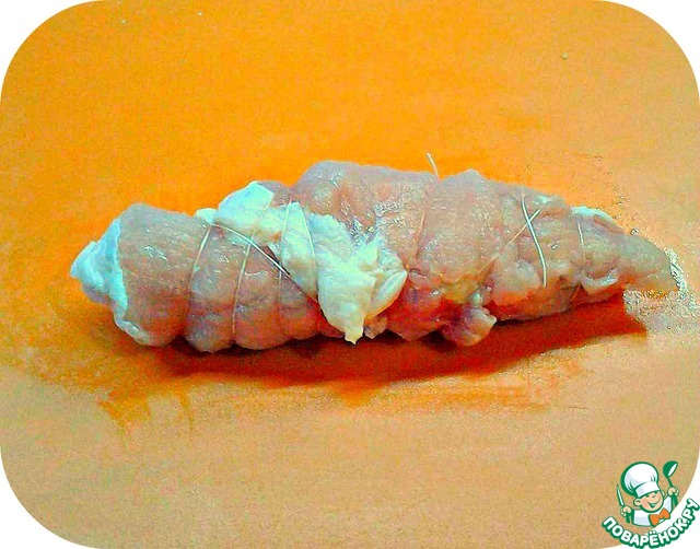 Кусочек мяса сворачиваем рулетом, и заматываем его ниткой.