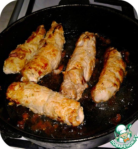 Сковороду разогреваем с маслом, добавляем туда мелко порезанное сало (те самые 50гр) и обжариваем рулеты с двух сторон, до появления корочки.