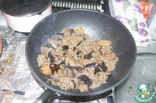 Обжаривает фарш до смены цвета. Добавляем чеснок-имбирь, слегка обжариваем. Добавляем баклажаны, не забываем все время помешивать.