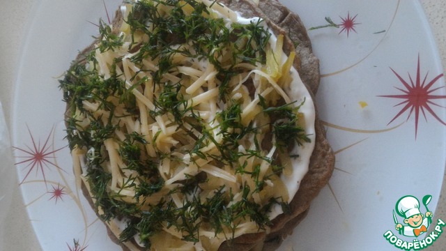 Я делаю сразу, после того как испекла блин укладываю начинку (можно испечь все блины и приступить к сборке). Смазываю майонезом, посыпаю зеленью с чесноком, сыр и солёные огурцы ( я тру сразу на блины ) кому как удобно