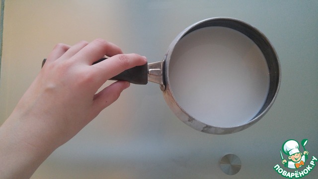 Готоыим сливочный слой. Половину молока отлить и смешать с желатином. Оставшуюся половину вместе со сливками поставить на медленный огонь, добавить сгущенку и пудру. Потом, непрерывно помешивая, влить вторую подовину молока с желатинлм. Нагреть до 75°С и снять с огня, не доводить до кипения.